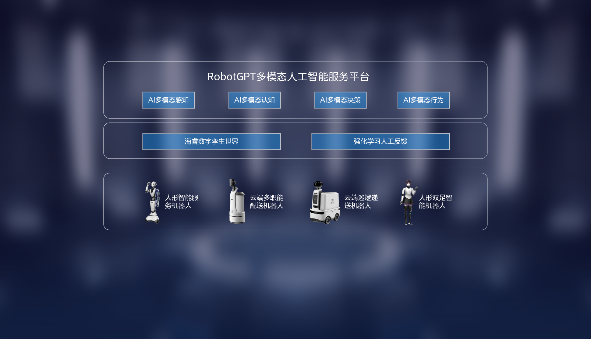 融合人工增强的智能视觉、智能语音、智能运动等人工智能能力,基于具备3D语义的数字孪生世界,为机器人运营提供各种智能服务